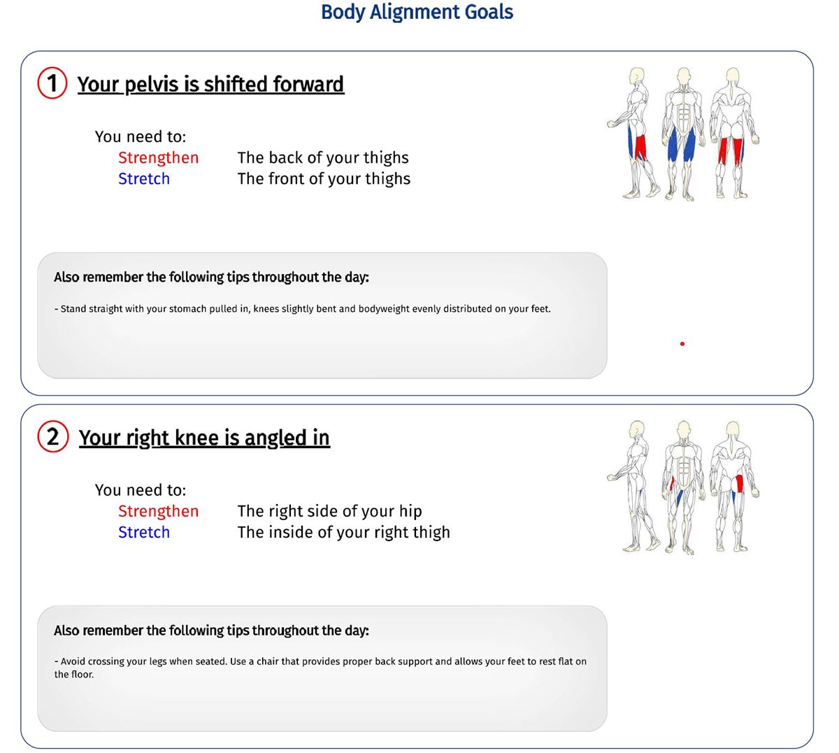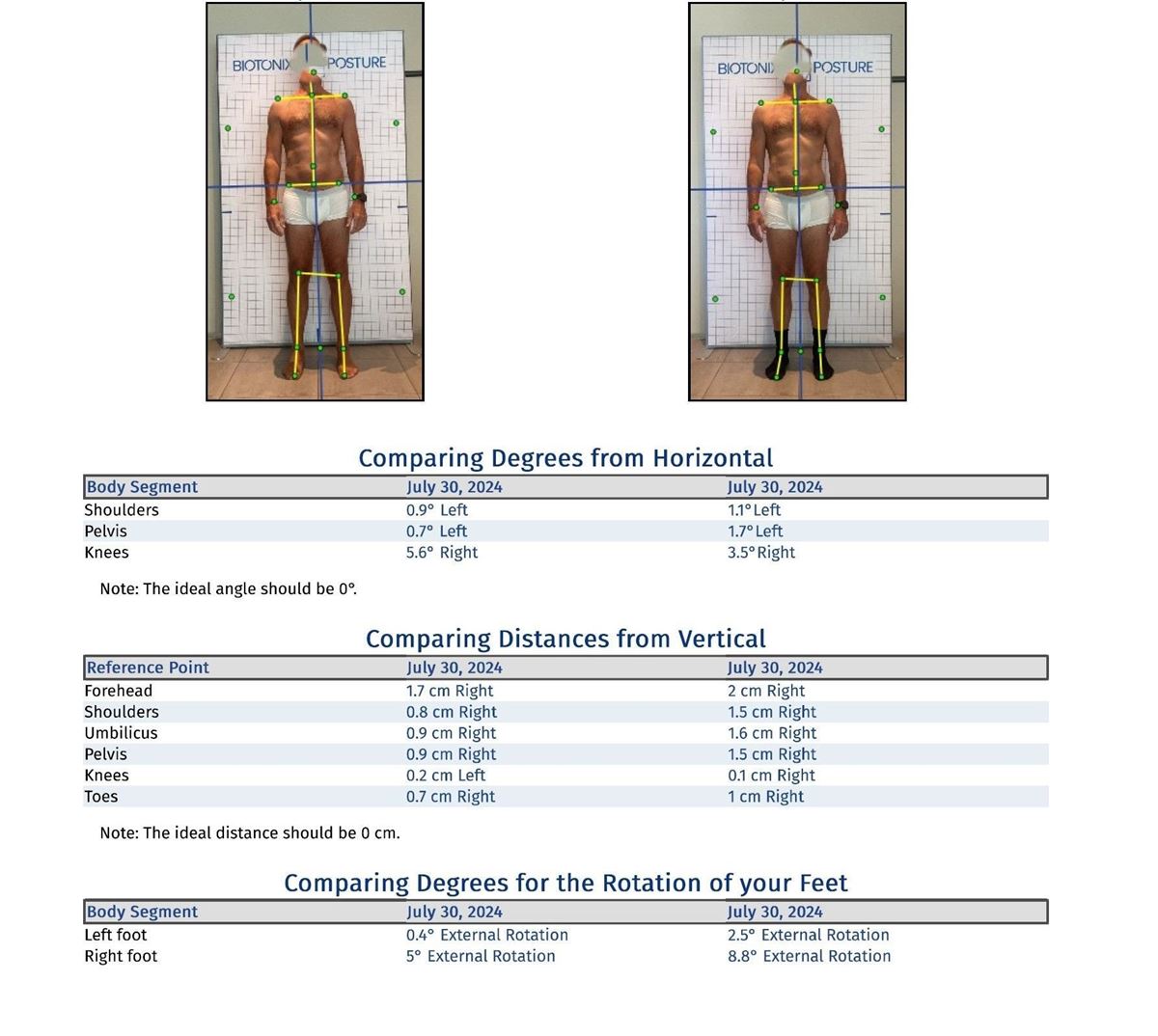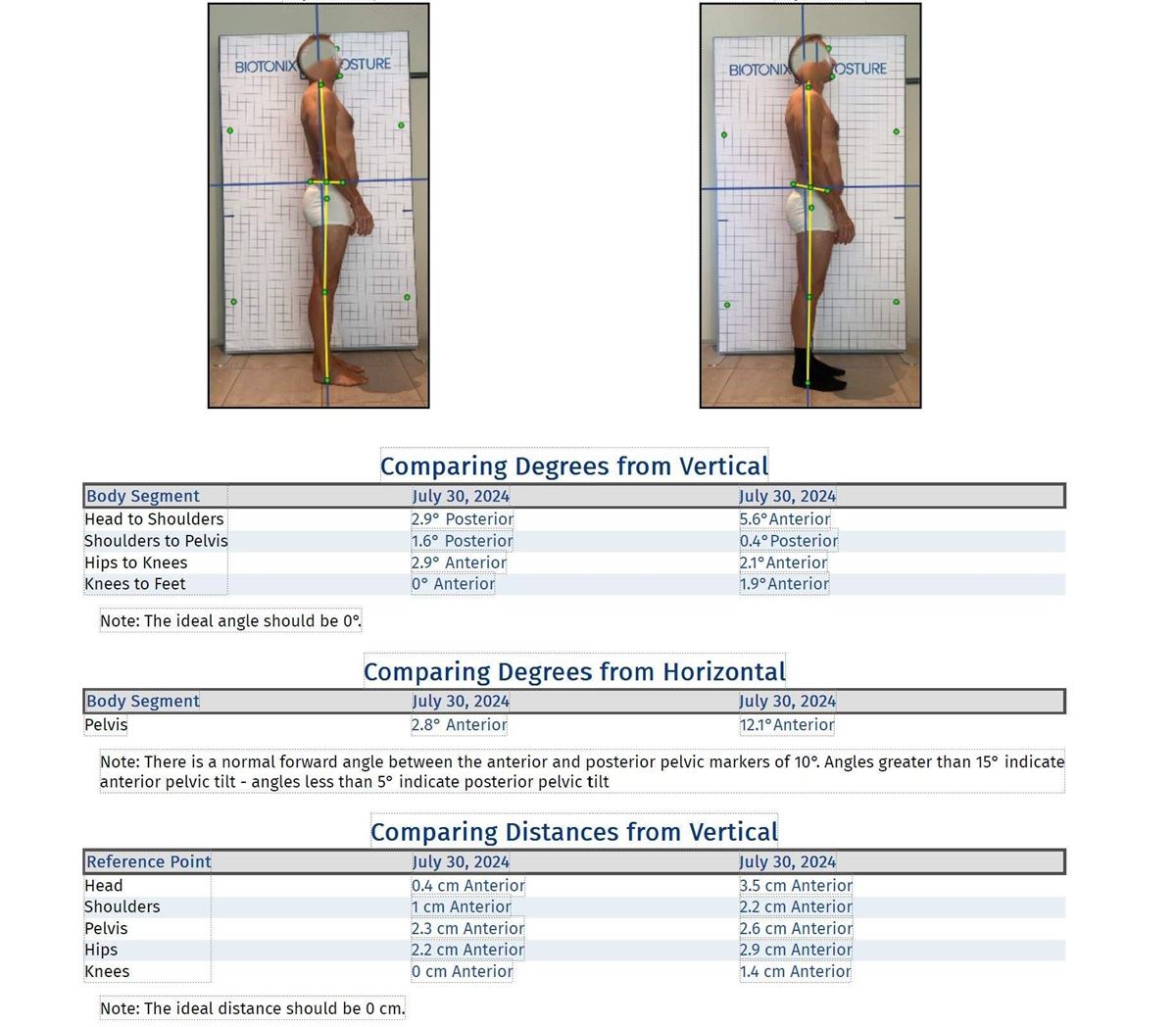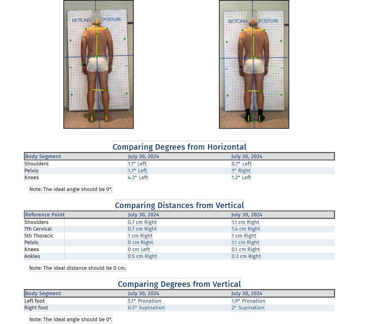 Houdingsanalyse op geijkte afstand en hoogte, tegen een referentieraster en met behulp van digitale fotografie in hoge resolutie, ondersteund door artificiële intelligentie, is een betrouwbare methode om lichaamshouding in hoeken en cijfers om te zetten. Een analyse vóór en ná de voorgestelde reeks gepersonaliseerde oefeningen (inbegrepen in het rapport) kunnen de eventuele verbeteringen op een objectiverende manier aantonen.